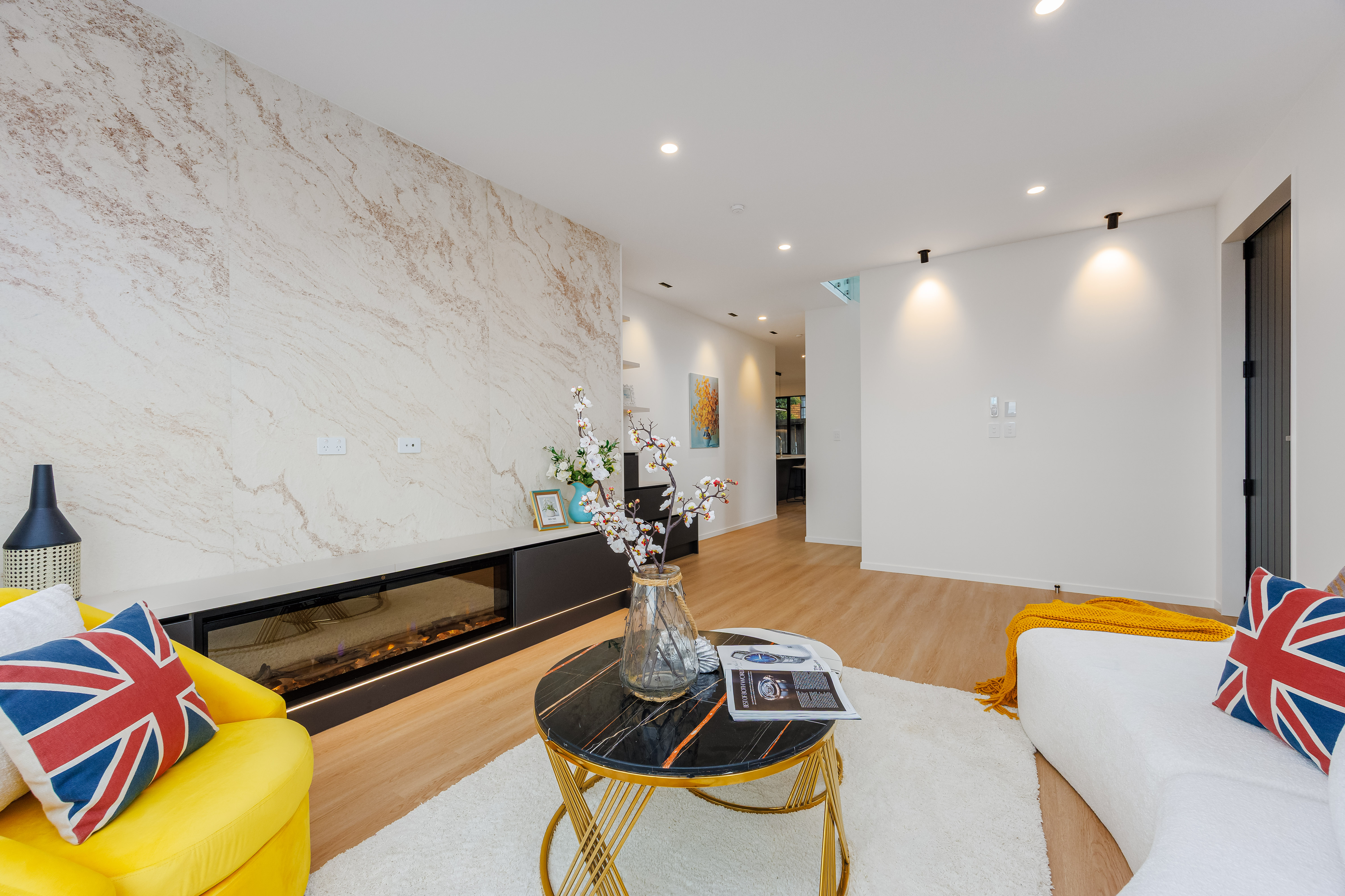 Offers 4 spacious bedrooms, 2 bathrooms, 2 toilets, and a master bedroom with its own ensuite, along with a dedicated study ideal for working from home. The main living area features a stylish fireplace, creating a warm and inviting atmosphere. At the heart of the home is an open-plan kitchen and dining area fitted with quality Bosch appliances and gas bottle cooking. The living space flows seamlessly to a sunny outdoor deck and grass area, perfect for entertaining or relaxing. The second floor enjoys beautiful mountain views, and the home also includes a single internal access garage.