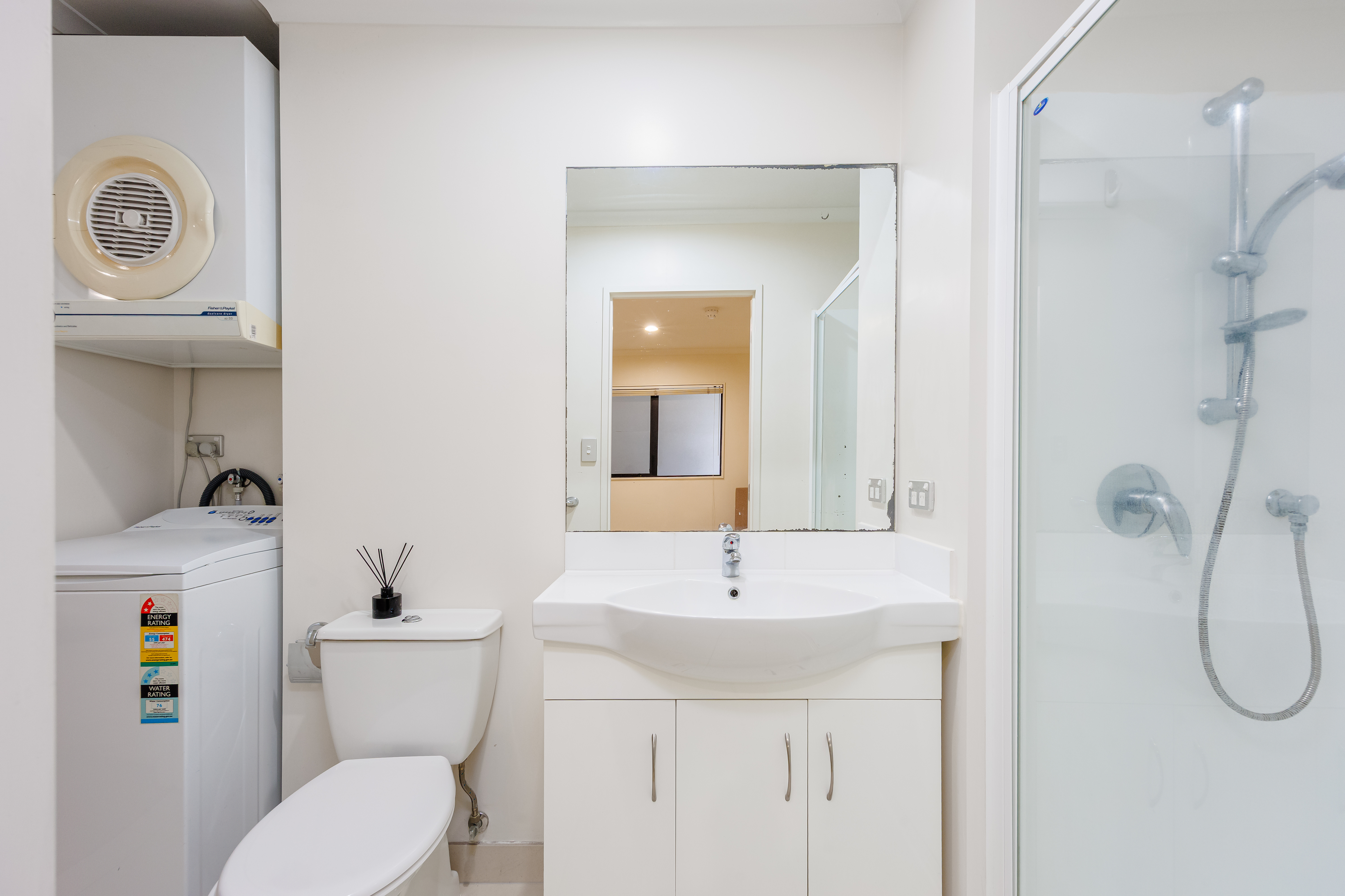 The FREEHOLD apartment covers a well-configured 63 sqm (approx.) floor plan where there's still some scope to redecorate and make it your own. The carpeted open plan lounge has a generous dining area while floor to ceiling glazing welcomes abundant natural light. Anchored by timber laminate flooring, the front entry combines with a corner kitchen where stainless steel dish drawer is fitted beneath underbench oven and an electric cooktop. Double bedrooms flank two similarly scaled ensuite bathrooms with one combining the fully equipped laundry nook while the hall cupboard is a handy bonus for storage.