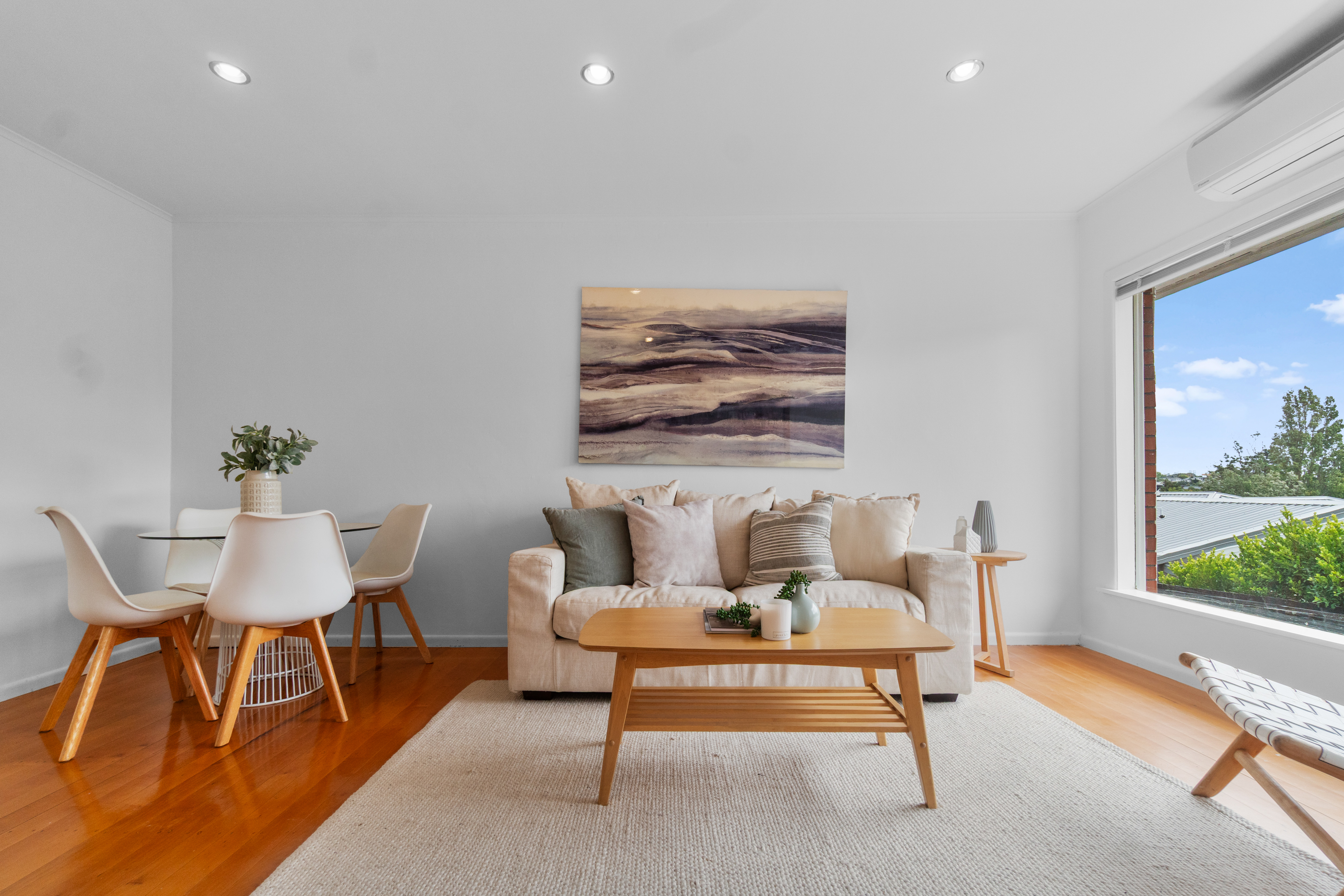 Original native timber floors enhancing the timeless ambiance contrast beautifully with freshly repainted white walls and anchor open plan living and dining areas. Copious all-day sunshine pours in through sizeable picture windows with heat pump for the chilly days and strategically oriented front and back doors encouraging breezy summertime ventilation. A contemporary kitchen still recalling the home's mid-century modern era features stainless steel benchtops, updated whiteware, and gas hob - with scope to renovate further down the track if desired. The bathroom has been similarly updated with shower over bathtub, heated towel rail, vanity and integrated stacked space-saving laundry nook. Two bedrooms both open out onto a colossal wraparound deck providing indoor/outdoor flow for entertaining or just relaxing with a wine as the kids and family pooch scamper about on flat lawns. A single lock up garage is part of a row in a freestanding structure provided for all four properties.