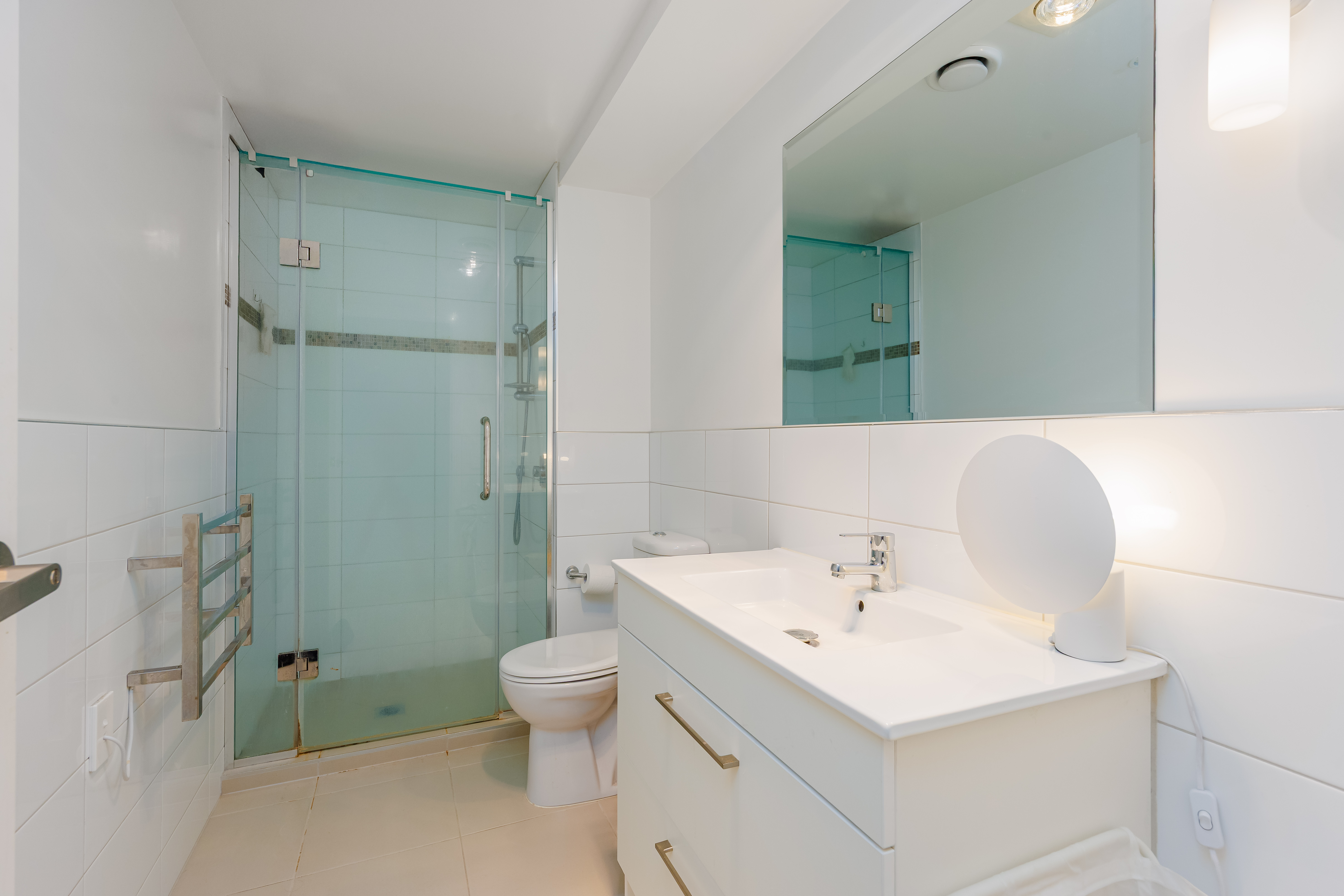 The bedroom has a built in closet and sits adjacent to the tiled bathroom combining frameless glass shower alcove, vanity, heated towel ladder and toilet. A hideaway cupboard is provided for a stacked laundry system and for those needing somewhere for their vehicle, options are available to rent a basement carpark for approximately $70 per week.