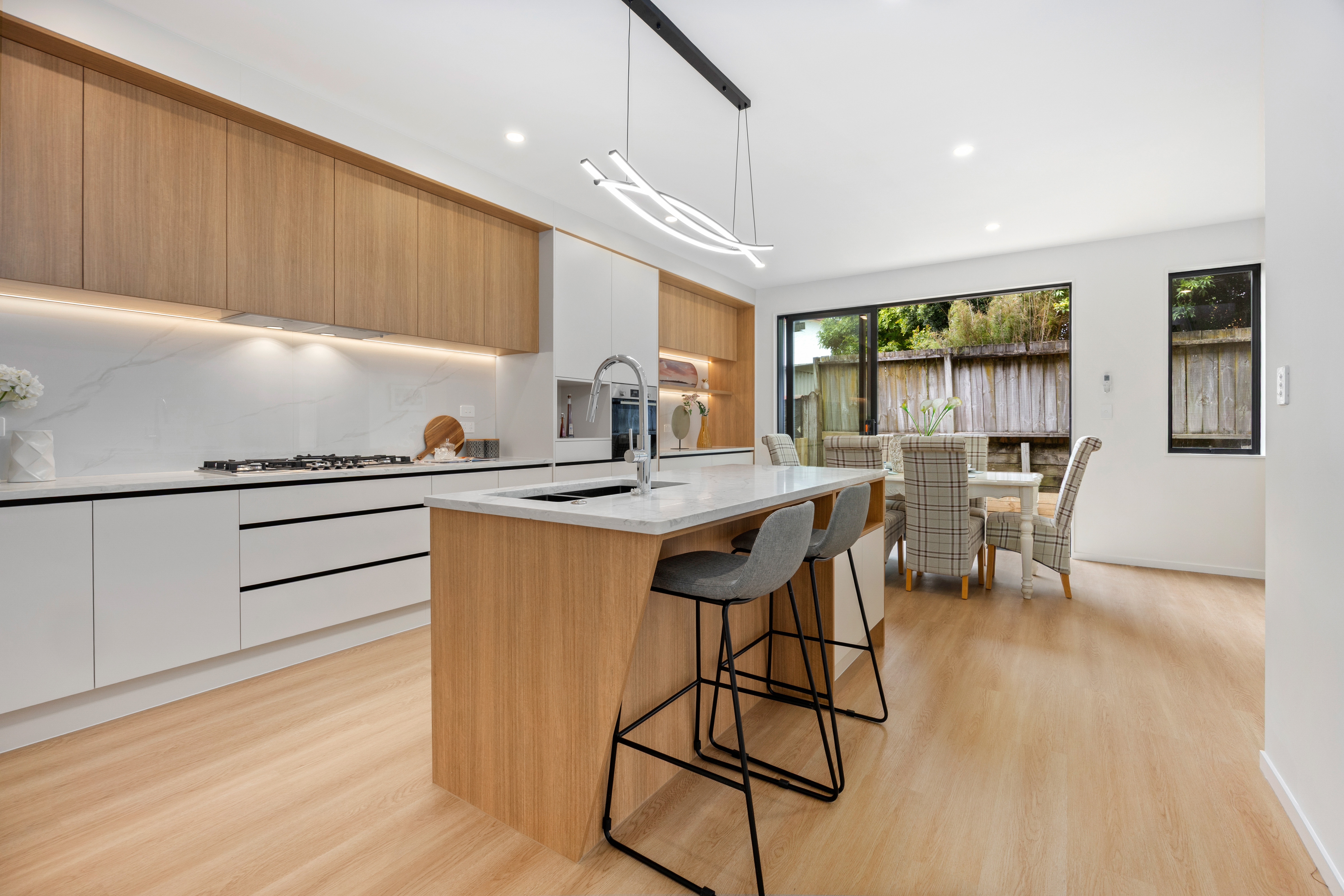 Offers 4 spacious bedrooms, 2 bathrooms, 2 toilets, and a master bedroom with its own ensuite, along with a dedicated study ideal for working from home. The main living area features a stylish fireplace, creating a warm and inviting atmosphere. At the heart of the home is an open-plan kitchen and dining area fitted with quality Bosch appliances and gas bottle cooking. The living space flows seamlessly to a sunny outdoor deck and grass area, perfect for entertaining or relaxing. The second floor enjoys beautiful mountain views, and the home also includes a single internal access garage.