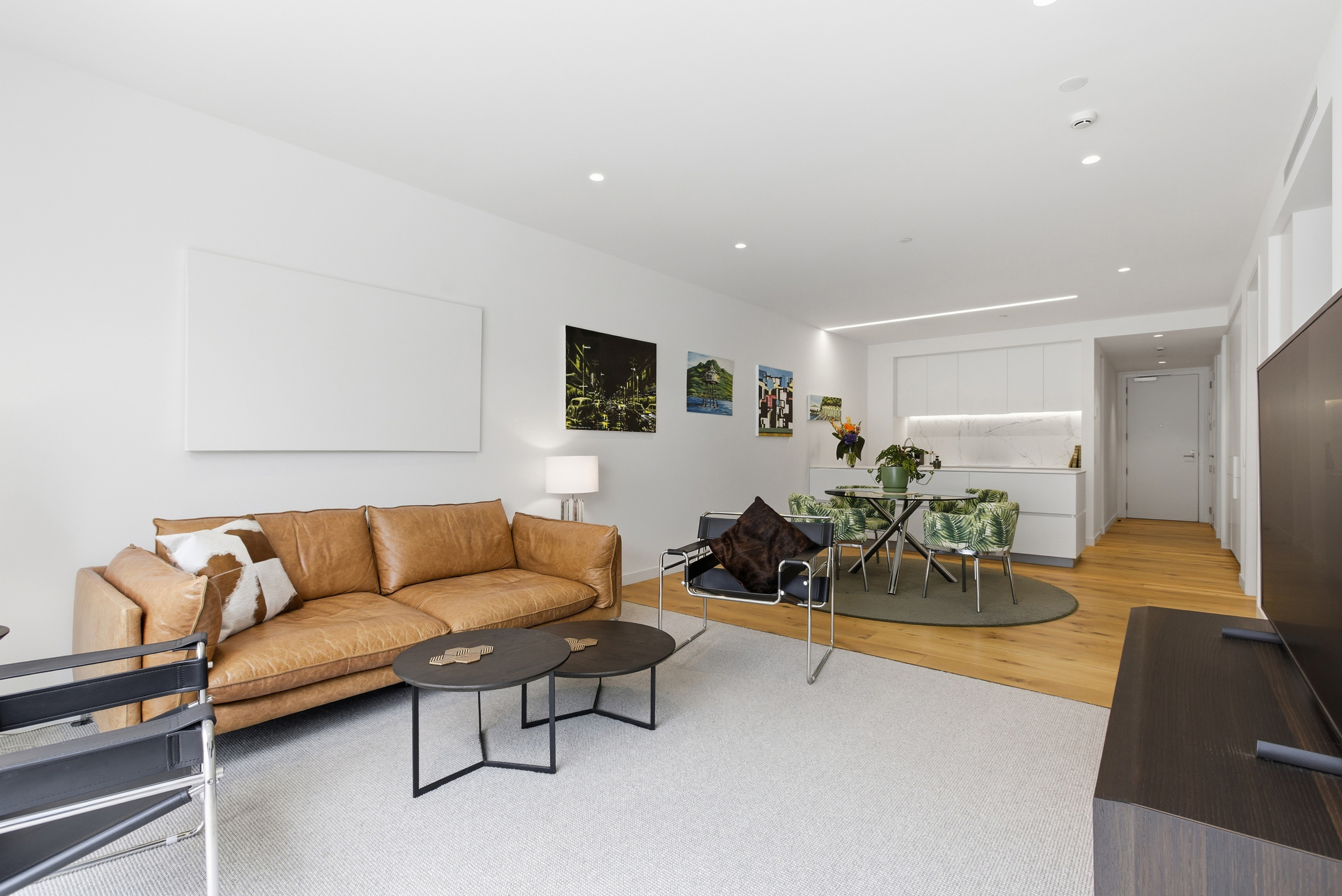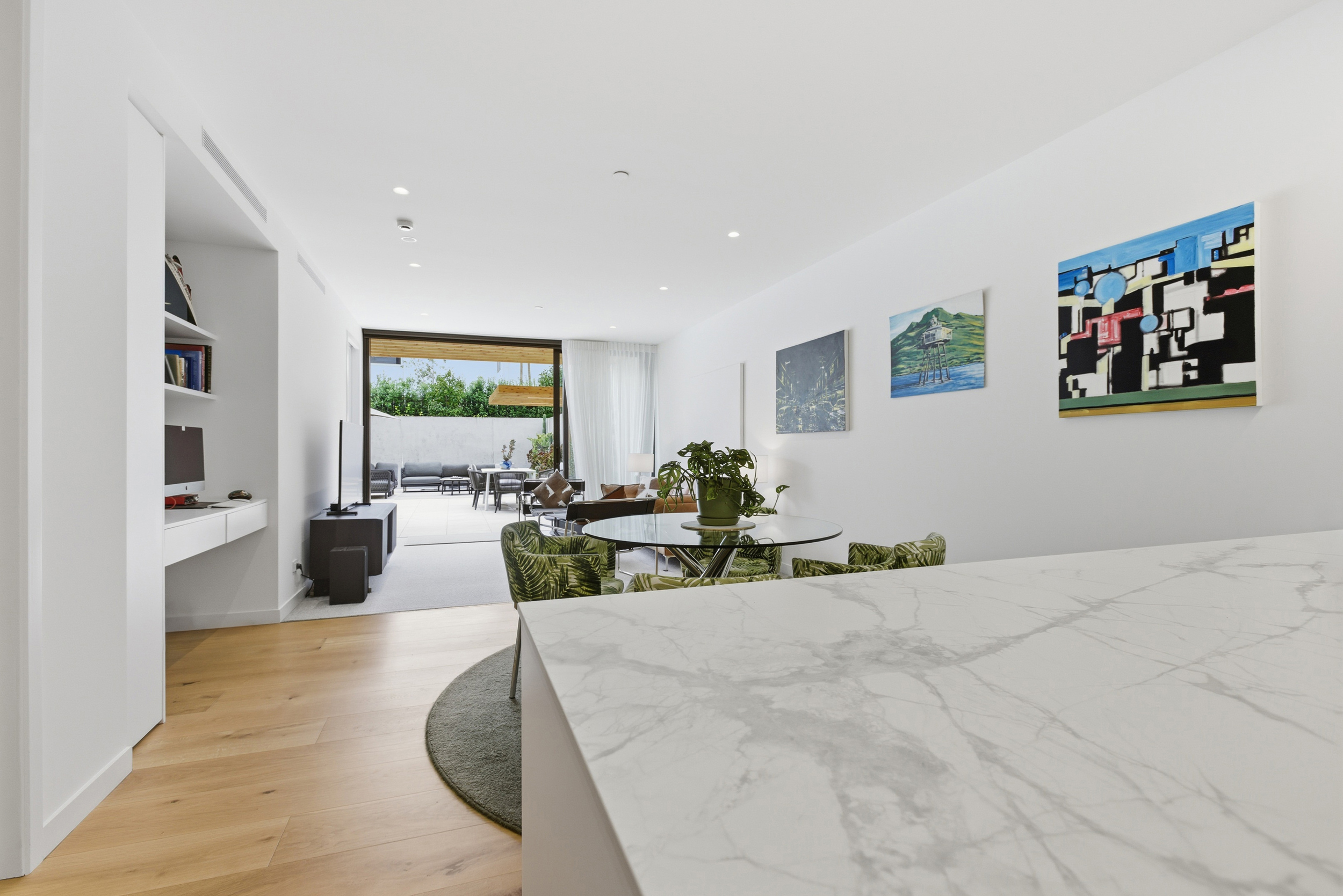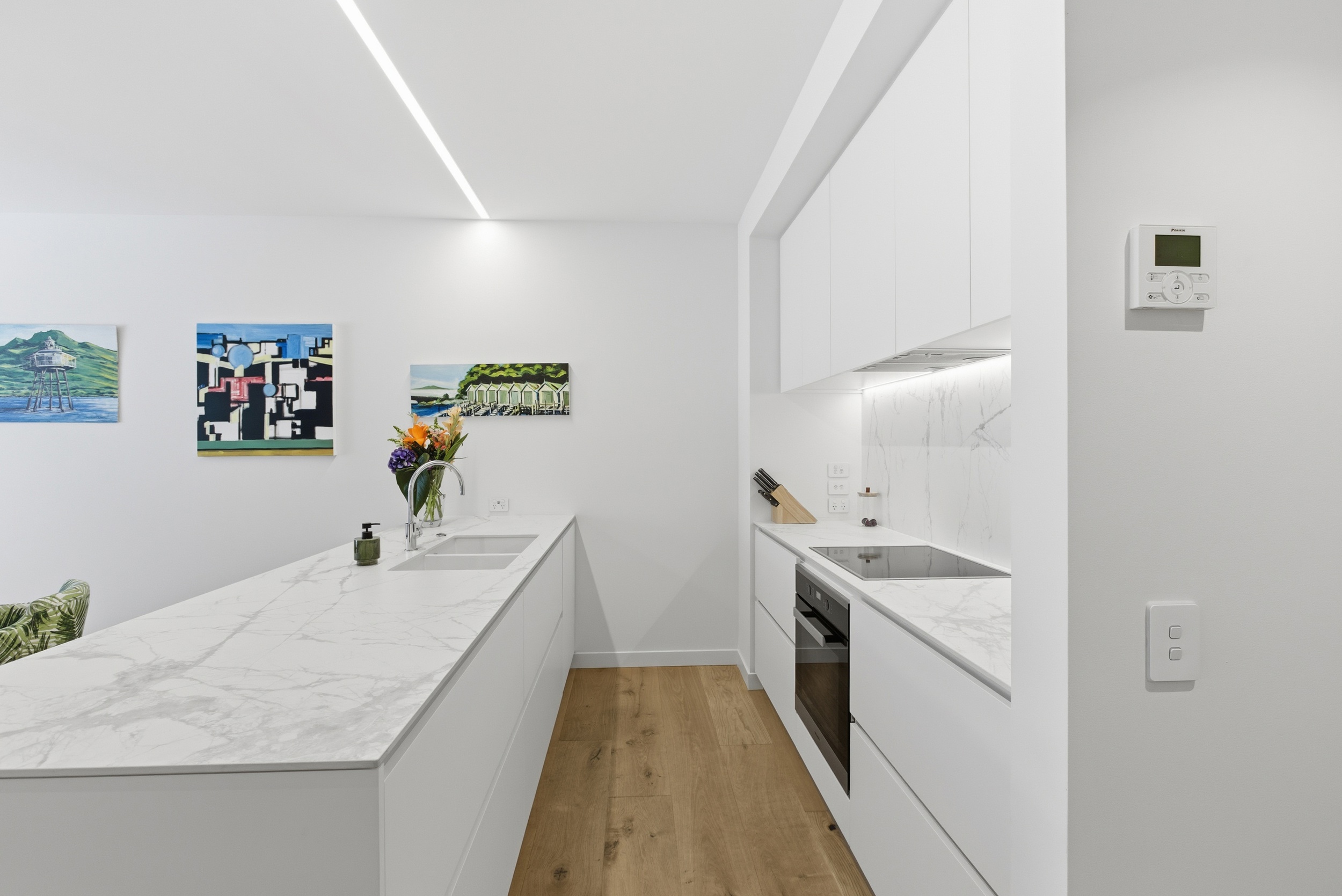 Offering approximately 92m² (more or less) of refined interiors with blonded European oak floors, Miele appliances with integrated fridge/freezer, Italian stone benchtops and an impressive 2.7m stud height. Floor-to-ceiling glazing enhances the light-filled open-plan living and connects seamlessly to the outdoors. Two double bedrooms include a master with an ensuite.