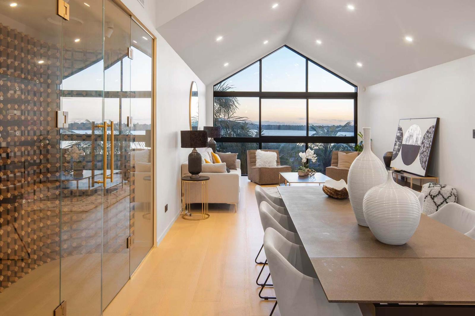 Framed by palms and striking architectural gables, its bold exterior gives way to light-filled interiors designed for effortless sophistication, enhanced by sweeping harbour and city views.