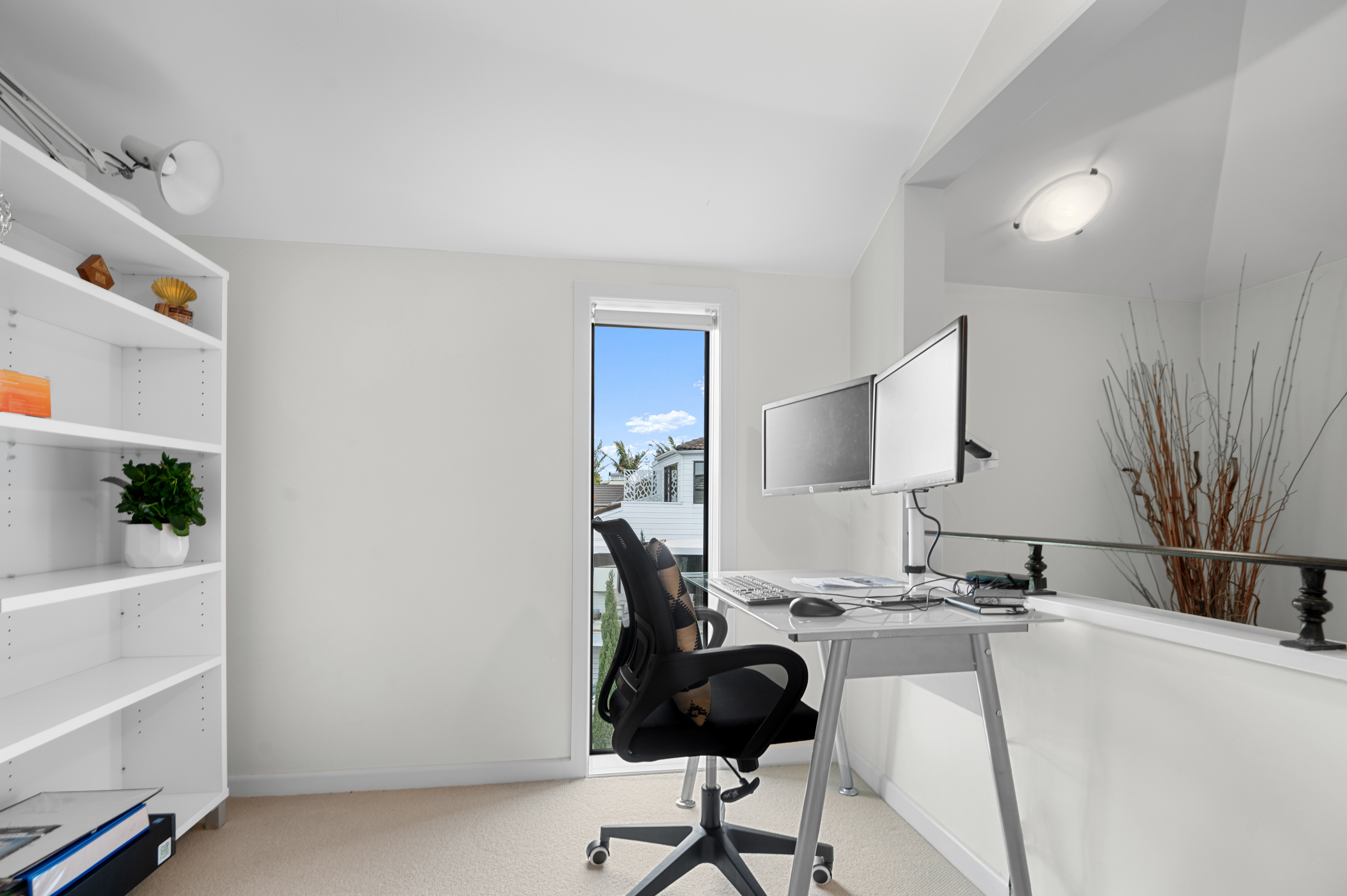 Two double bedrooms and casual family lounge flank the downstairs foyer with a seamless flow to the patio and BBQ area. The family bathroom features corner spa bath, separate shower and vanity. On the penthouse floor a mezzanine study sits adjacent to master bedroom with walk in wardrobe, substantial day room and an ensuite with tiled floor, frameless glass shower and dual basin vanity. There are vast amounts of storage dotted throughout the house.