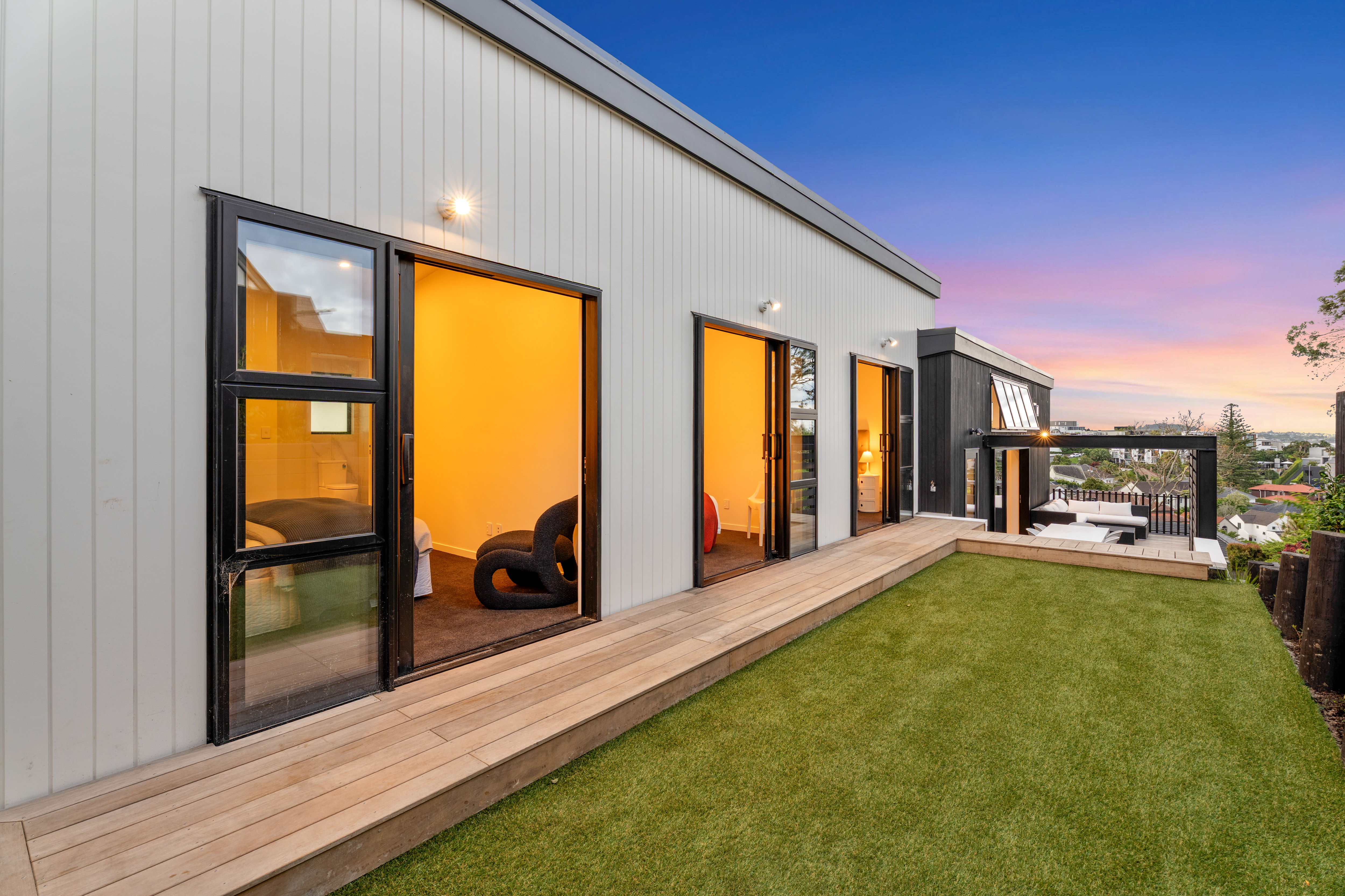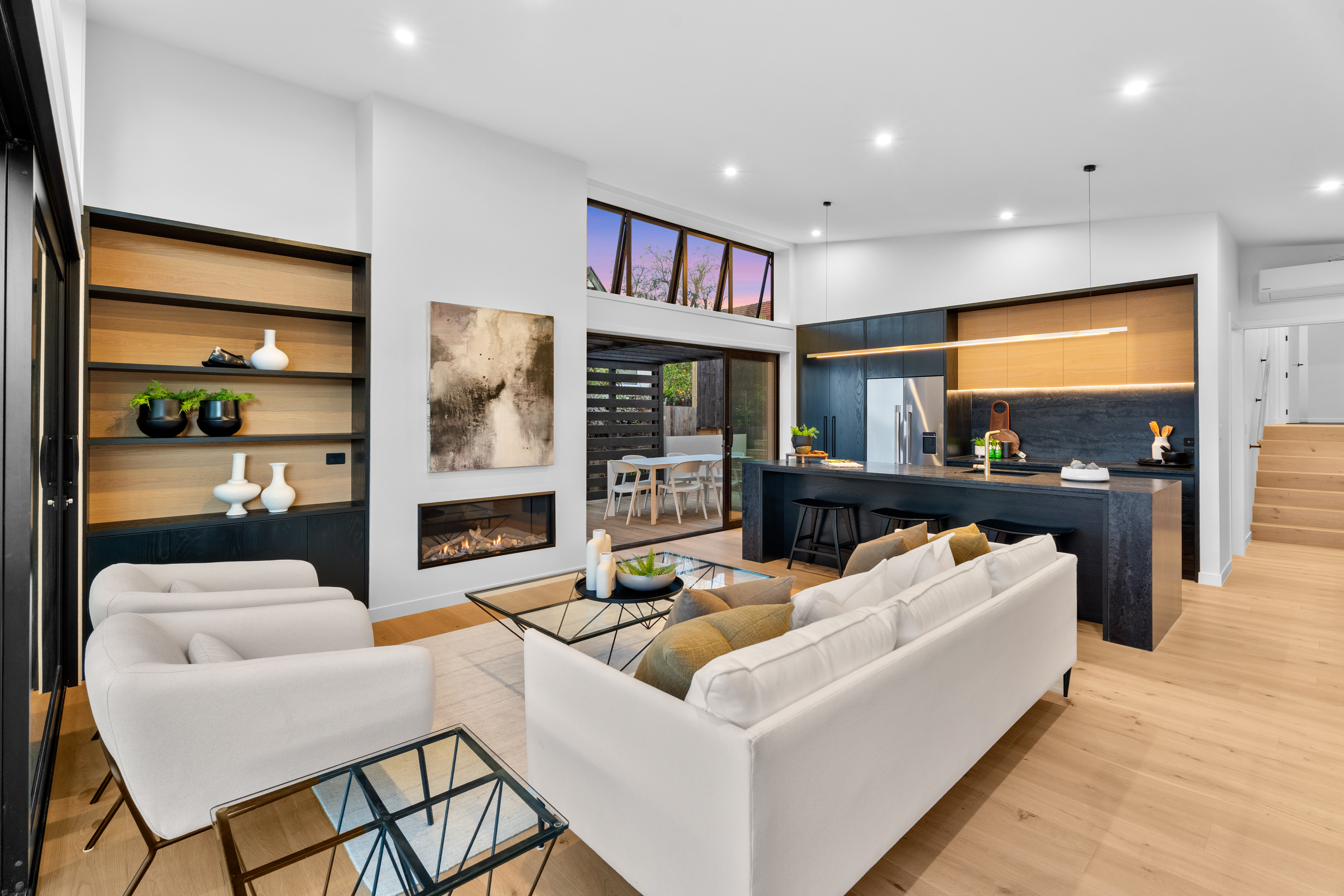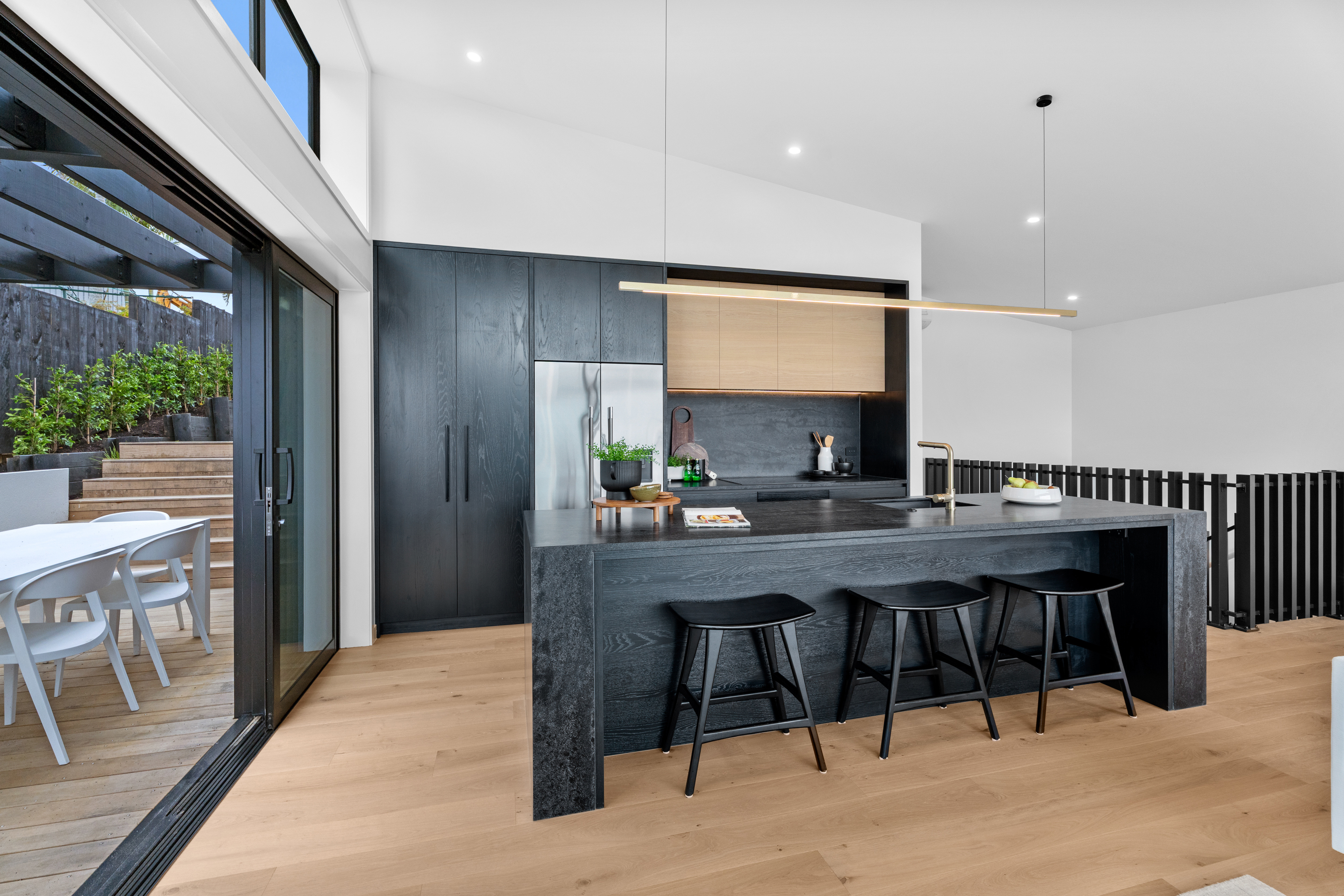 A striking kitchen boasts attractive black cabinetry and integrates Miele appliances including an induction cooktop, timeless brass tapware and durable stone slab counters. Nearby stackers open wide to usher guests out to the pergola covered alfresco zone, perfect for entertaining. Tiered decking borders putting-green smooth turf accessible from three of the bedrooms - one being the master complete with heat pump, custom walk-in wardrobe, and ensuite featuring dual vessel basins, black fittings and innovative wet shower. Echoing the same designer chic, the main family bathroom includes a back to wall bathtub while the guest powder room and sizeable laundry/scullery are similarly executed to perfection. The fourth bedroom is separate on the ground floor providing versatility and separation from the main living levels.