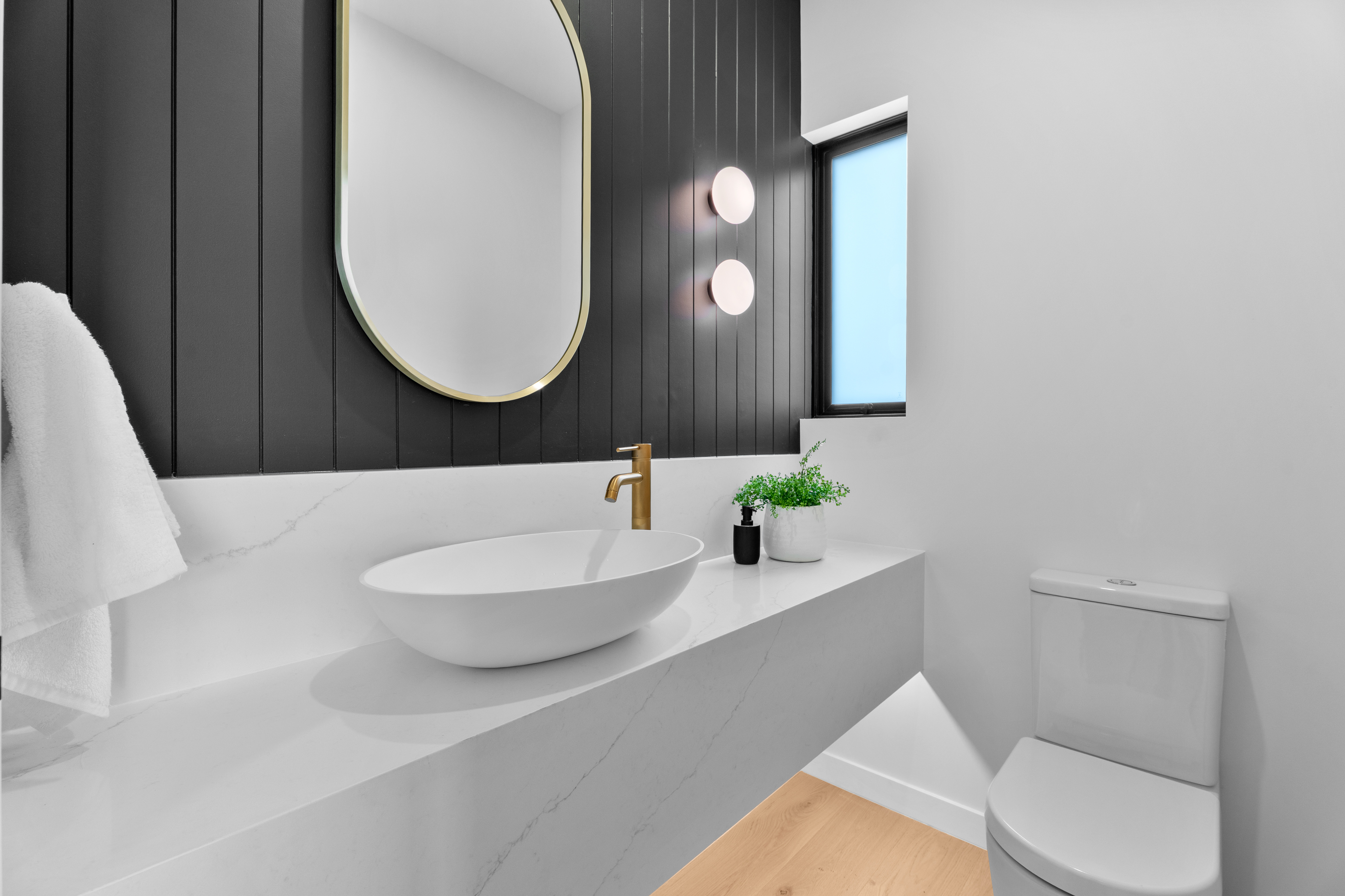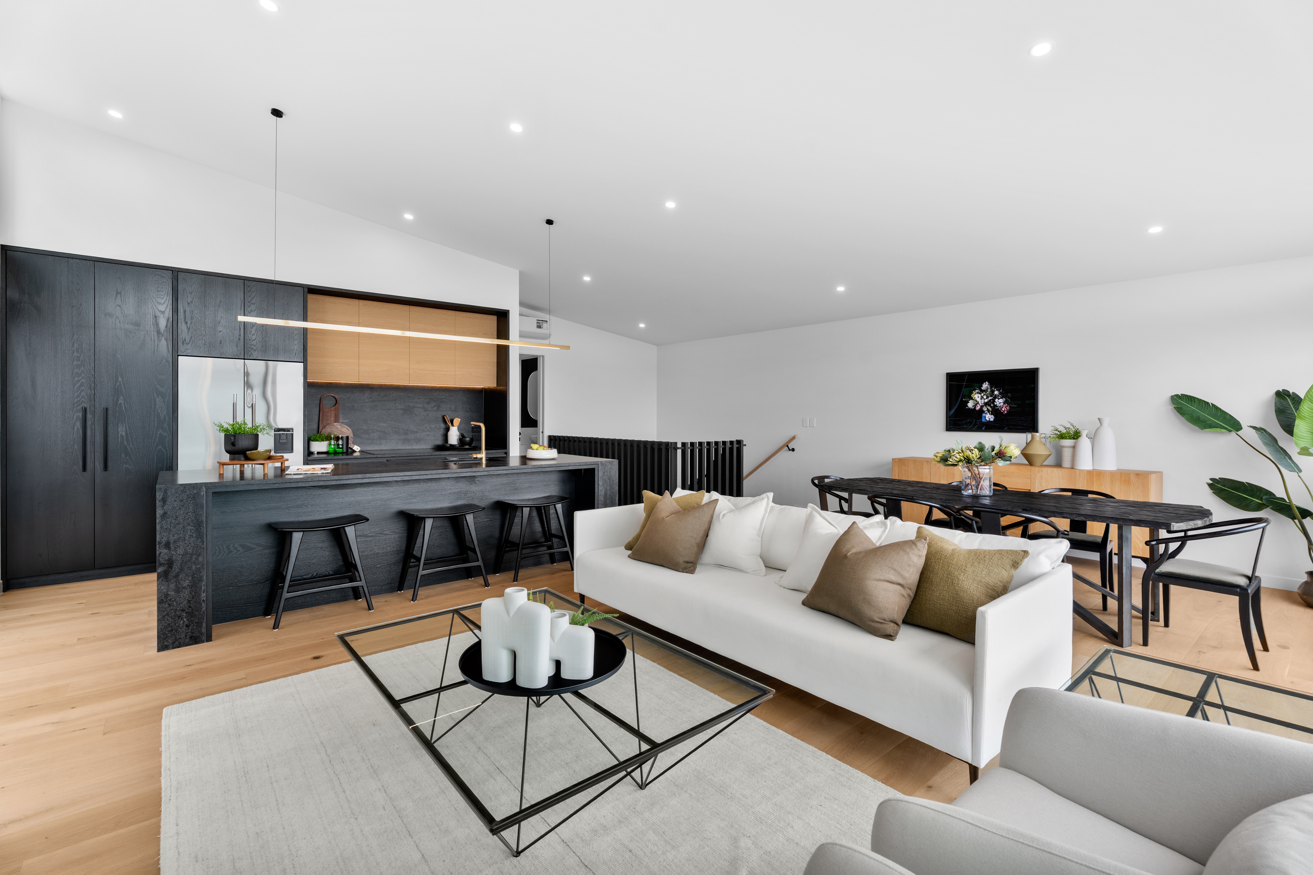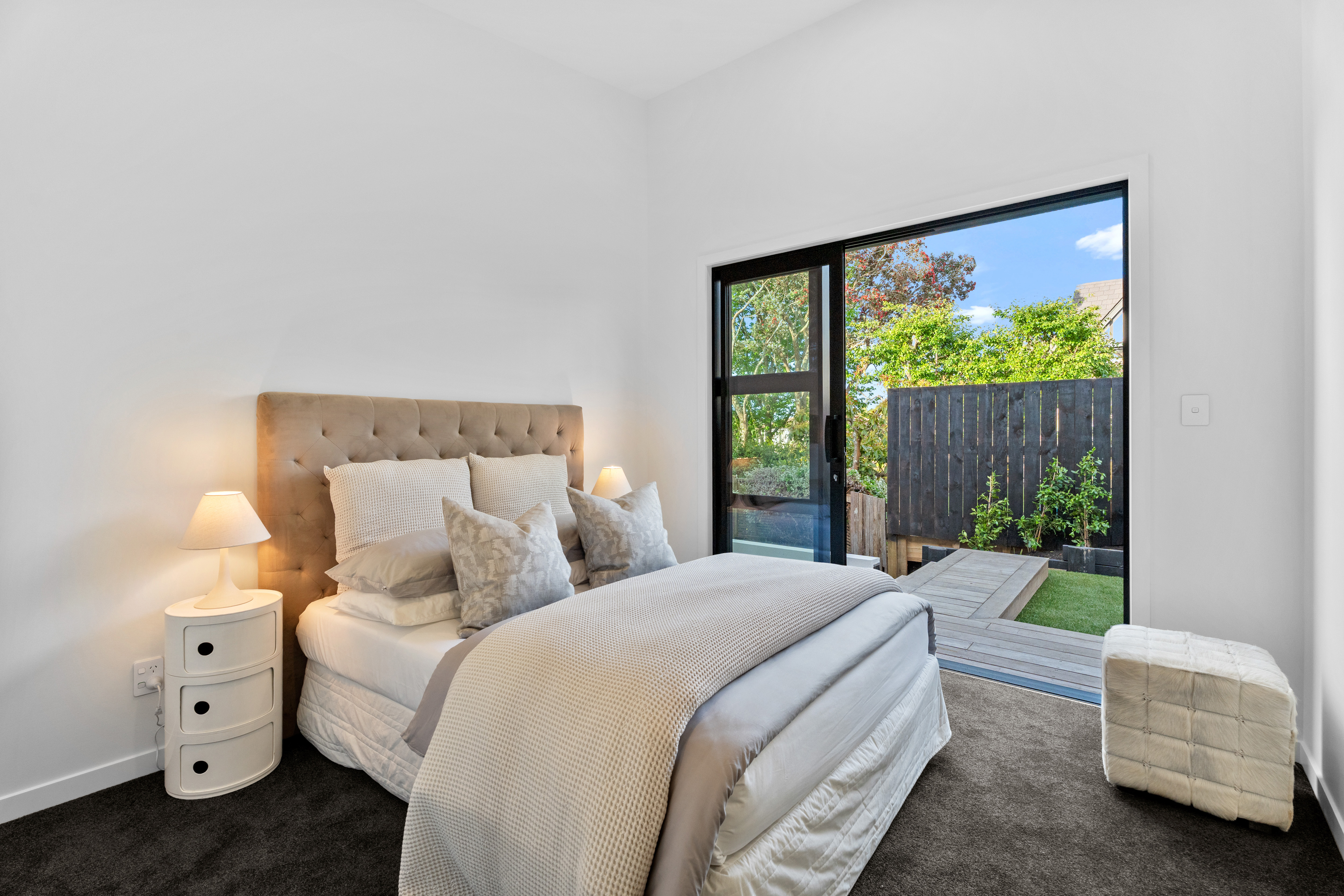 A striking kitchen boasts attractive black cabinetry and integrates Miele appliances including an induction cooktop, timeless brass tapware and durable stone slab counters. Nearby stackers open wide to usher guests out to the pergola covered alfresco zone, perfect for entertaining. Tiered decking borders putting-green smooth turf accessible from three of the bedrooms - one being the master complete with heat pump, custom walk-in wardrobe, and ensuite featuring dual vessel basins, black fittings and innovative wet shower. Echoing the same designer chic, the main family bathroom includes a back to wall bathtub while the guest powder room and sizeable laundry/scullery are similarly executed to perfection. The fourth bedroom is separate on the ground floor providing versatility and separation from the main living levels.