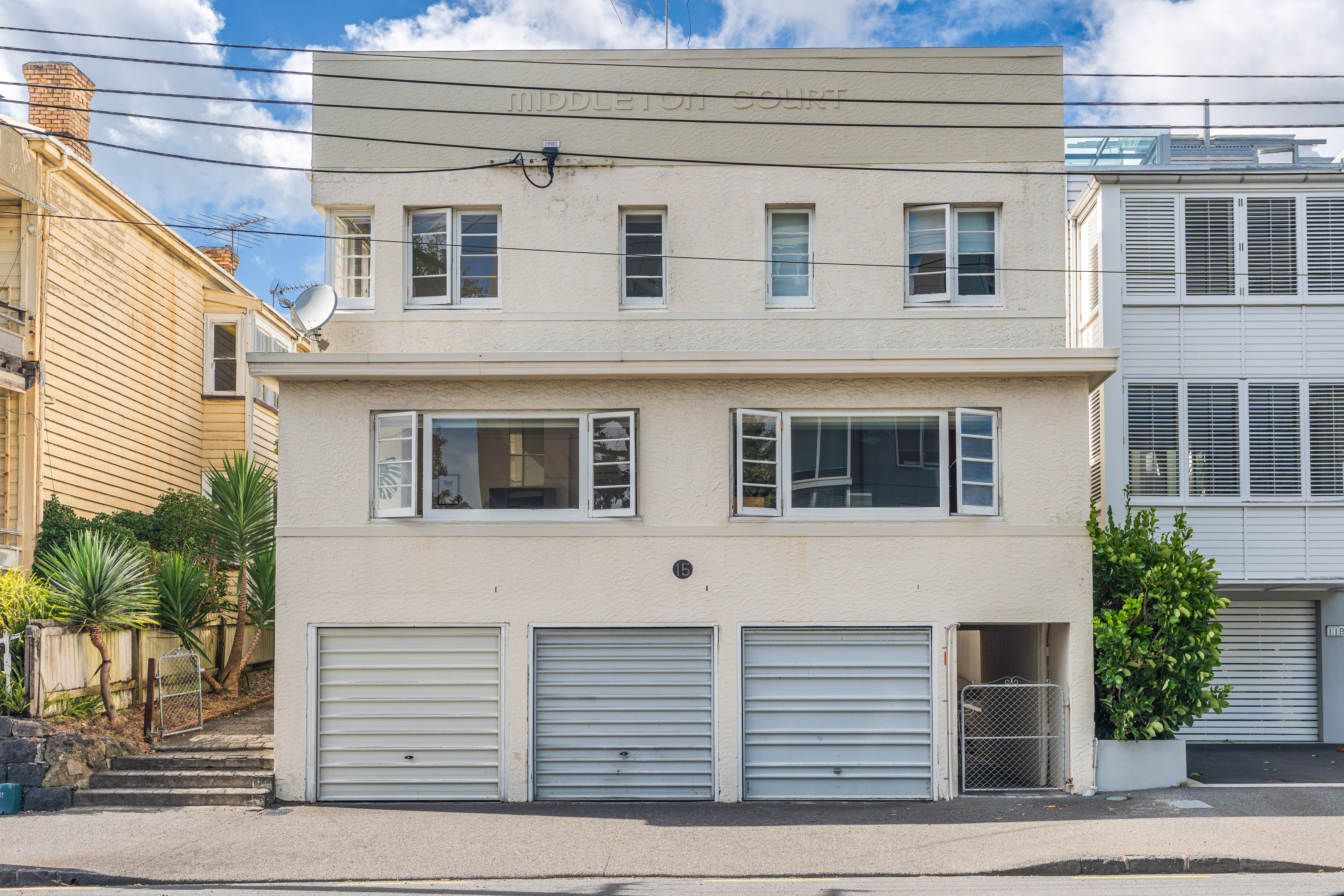 Showcasing the archetypal geometric lines of the post war era, this stately Art Deco 1930s building at the margins of Newmarket's buzzy cosmopolitan precinct and in Double Grammar Zone, is a rare offering for investors looking for a property that hits different. Tightly held in the same family for half a century, the 325 sqm (approx.) masonry and brick clad complex built above three single garages is occupied by a total of five flats with some capturing Rangitoto Island and Waitemata Harbour views.