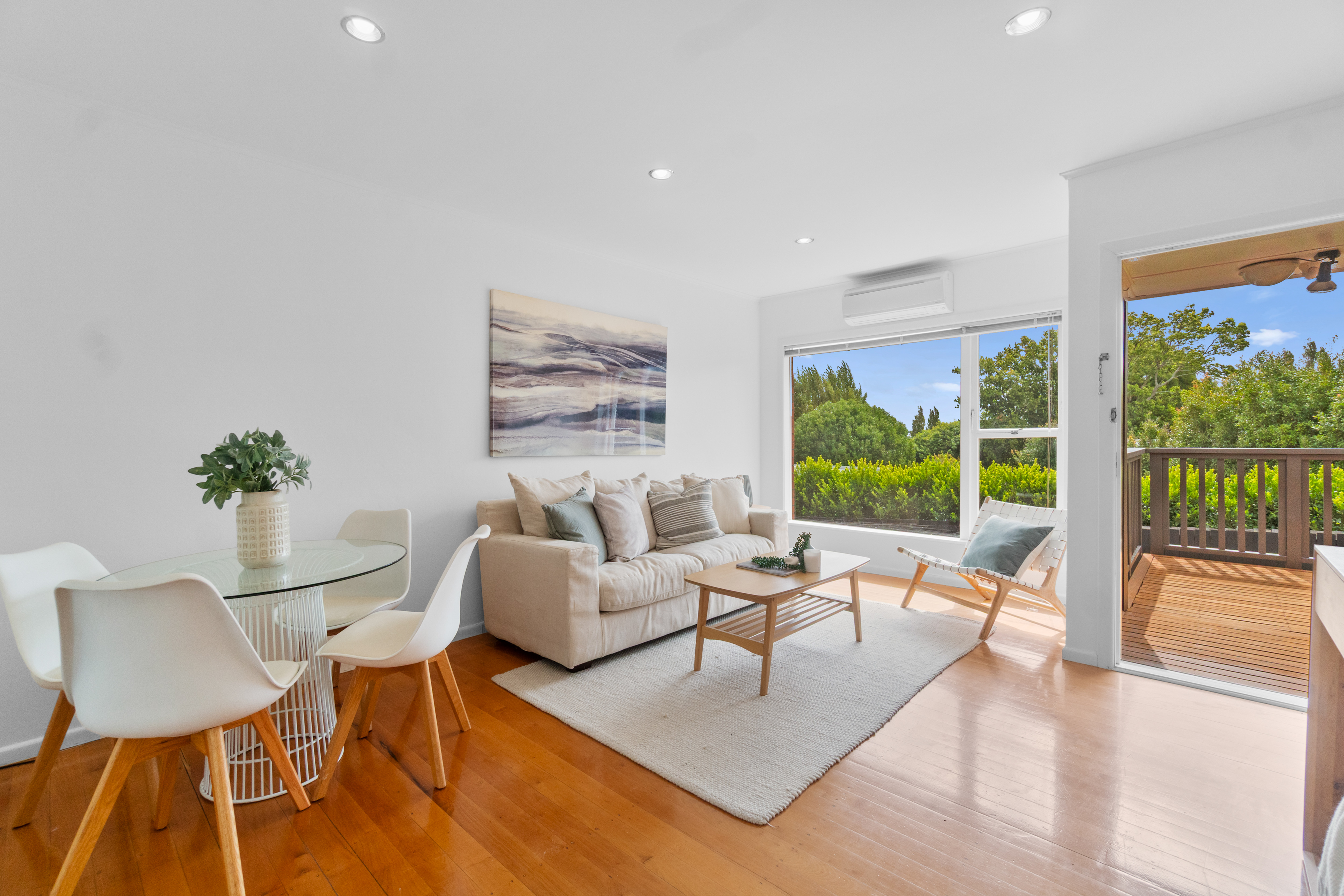 Original native timber floors enhancing the timeless ambiance contrast beautifully with freshly repainted white walls and anchor open plan living and dining areas. Copious all-day sunshine pours in through sizeable picture windows with heat pump for the chilly days and strategically oriented front and back doors encouraging breezy summertime ventilation. A contemporary kitchen still recalling the home's mid-century modern era features stainless steel benchtops, updated whiteware, and gas hob - with scope to renovate further down the track if desired. The bathroom has been similarly updated with shower over bathtub, heated towel rail, vanity and integrated stacked space-saving laundry nook. Two bedrooms both open out onto a colossal wraparound deck providing indoor/outdoor flow for entertaining or just relaxing with a wine as the kids and family pooch scamper about on flat lawns. A single lock up garage is part of a row in a freestanding structure provided for all four properties.