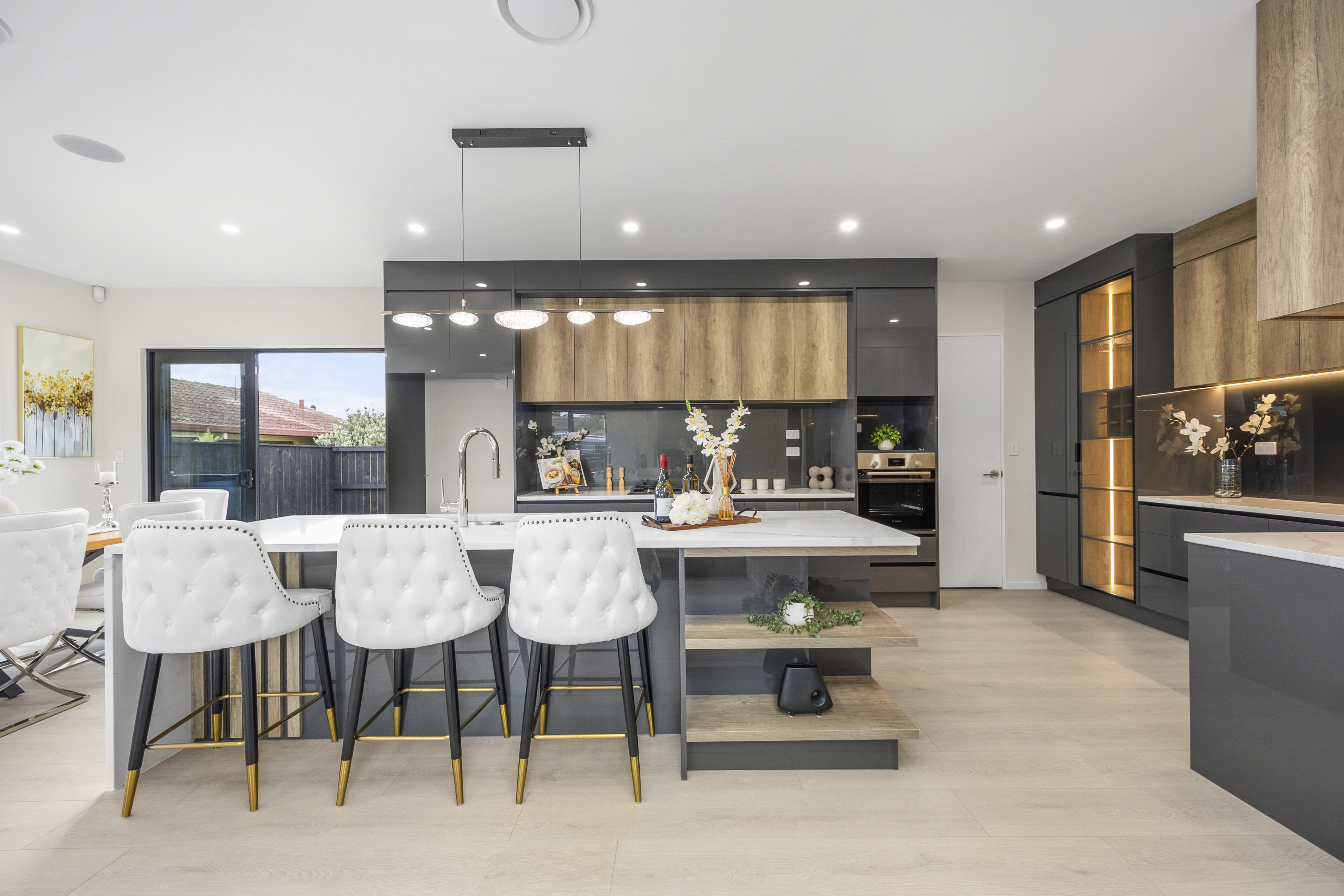 The 280 sqm (approx.) double-glazed two-level residence prioritises high-specification fixtures and fittings and a considered interior palette in neutral hues. Facing north to maximise the sun, the well-lit open plan lounge and dining areas anchored by light-toned timber laminate flooring imbue this domain with a crisp, chic ambiance. A ravishing designer kitchen gleams with the latest Bosch appliances and sleek timber and high-gloss lacquer cabinetry while a stone topped waterfall island is an engaging spot to rendezvous with friends over a glass of wine. Daily life flows with ease as multiple sliders allow access out onto a sizable alfresco deck and perimeter garden pathways. The separate media lounge is a multipurpose retreat as it also serves the adjacent guest/grandparents' quarters - a double bedroom with tiled ensuite bathroom.