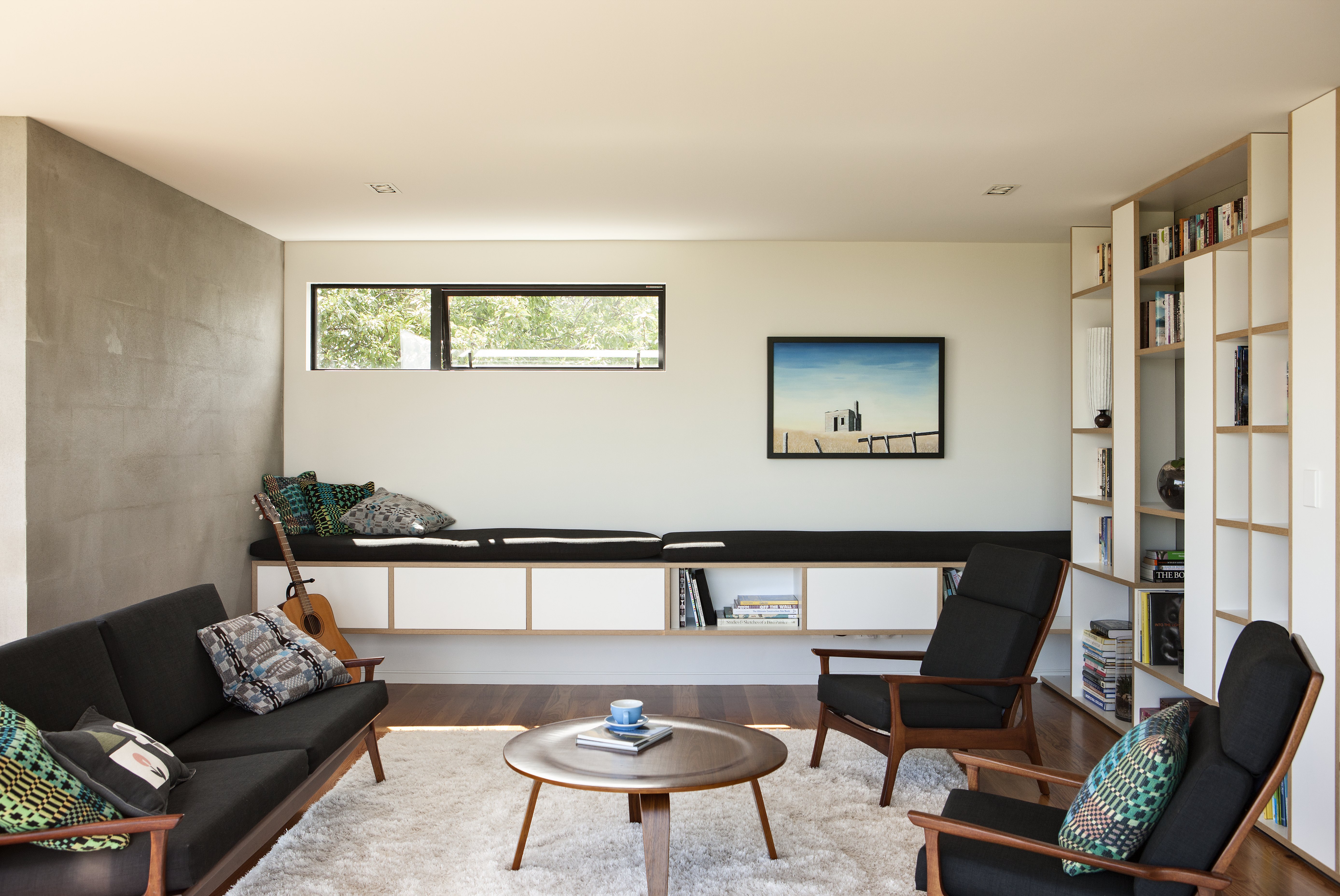 Along the back wall of this extension by Matter Architects is low, built-in storage that doubles as seating.